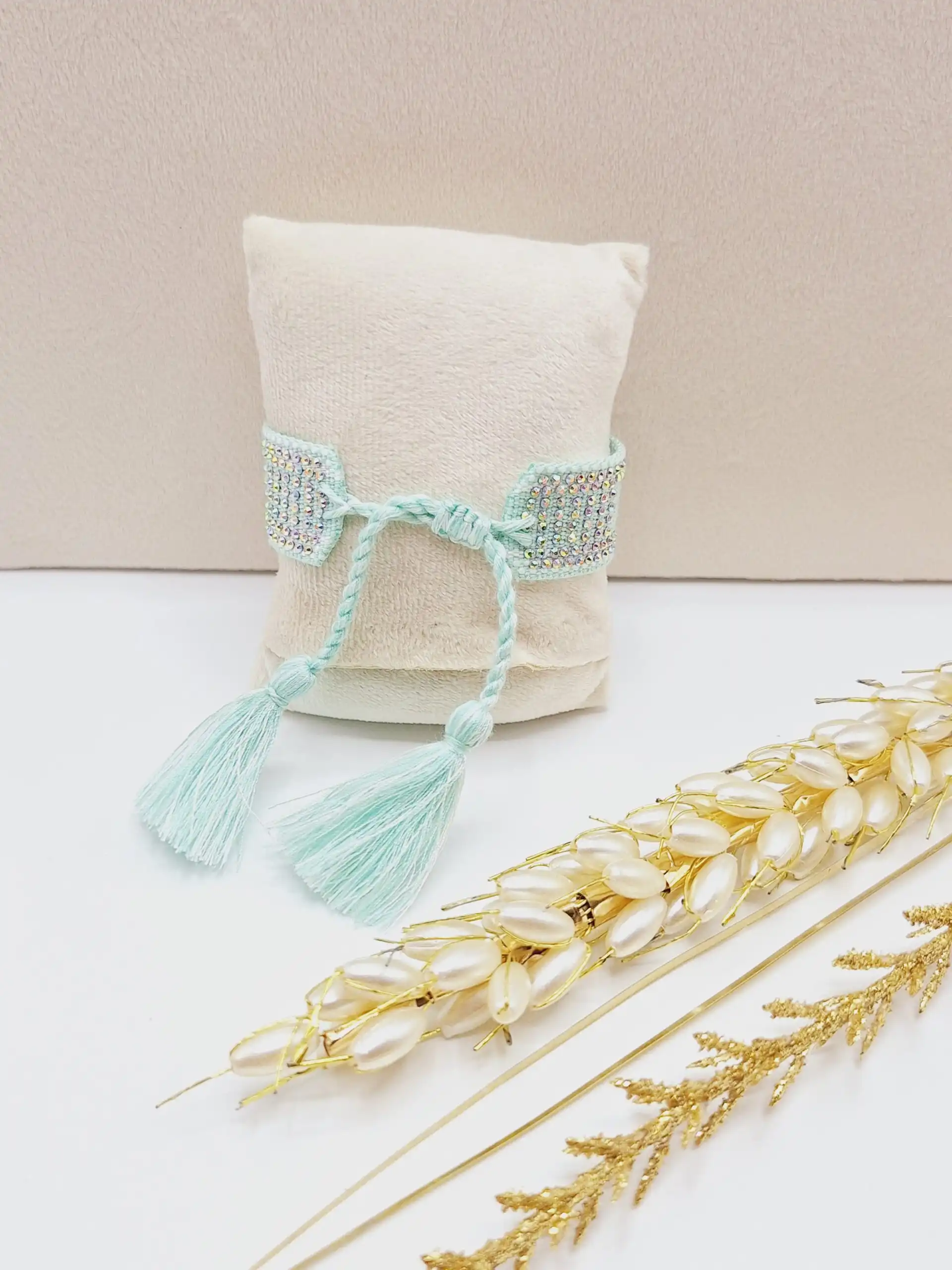 این دستبند پارچهای نگیندار الهام گرفته شده از طراوت و حس آرامش طبیعت است و مناسب خانمهایی که عاشق اکسسوریهای دخترونه، شیک و فانتزی با کمی درخشش هستند 💚💙✨😍