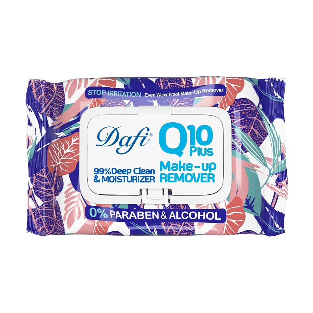 دستمال مرطوب پاک کننده آرایش دافی مدل Q10 یکی از این محصولات است که بدون نیاز به آب و صابون پوست را از هرگونه آرایش ضد آب پاک کرده و حاوی عصاره گل های بهاری و آنزیم Q10 است که التهاب، قرمزی و حساسیت پوستی را رفع می‌کند. بدون الکل و پارابن است که به پوست آسیبی نمی‌رساند و فاقد صابون است که نیازی به شستشو با آب ندارد. این محصول به دلیل دارا بودن عصاره شکوفه های گیلاس ژاپنی و فلاونوئید یک آنتی اکسیدان قوی است که از ایجاد جوش و آکنه جلوگیری می‌کند. از این دستمال به عنوان آبرسان و مرطوب کننده نیز می‌توان استفاده کرد. در هر بسته بندی از این محصول 50 عدد قرار گرفته است و درب روی این دستمال از خشک شدن آن جلوگیری می‌کند.