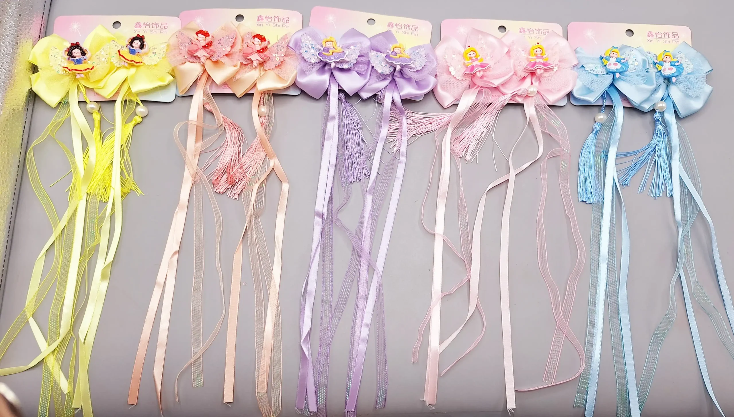 ست 2 تایی گیره مو پاپیونی طرح دختران پرنسسی همراه با آویز نواری و نگین دار