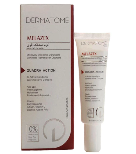 کرم ضد لک قوی ملازکس درماتوم، با ترکیبات اختصاصی خود بکب از بهترین کرم ها برای از بین بردن لک و تیرگی می باشد و برای انواع پوست حتی پوست های حساس نیز مناسب است. استفاده از این محصول به دلیل مهار کردن آنزیم های تولید ملانین در پوست موجب از بین رفتن لک ها شود و همچنین از ایجاد لک جدید نیز جلوگیری می نماید.